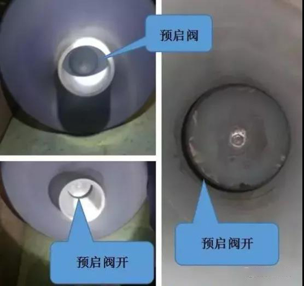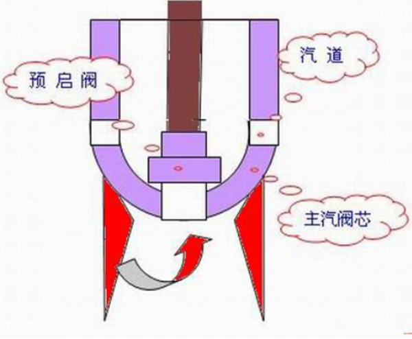 预启阀位于主汽阀阀芯内,预启阀阀芯直接连接在主汽阀阀杆上,主汽阀油动机开始动作后,先开启预启阀,当预启阀全开后,主汽阀才在阀杆的带动下再逐渐打开。从预启阀的结构上来讲,自动关闭器(自动主汽阀)动作后,先开预启阀,等预启阀全开后,主汽阀才开。